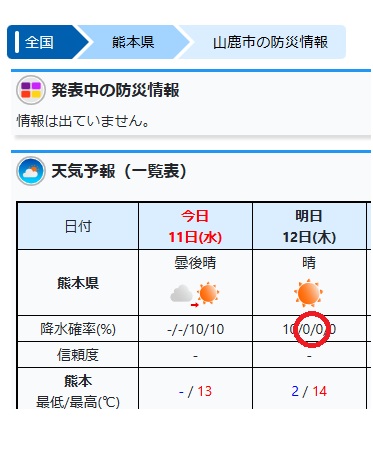 気象庁・山鹿市24時間を4分割で真ん中2項目のAM6:00~PM6:00の時間で判断いたします。